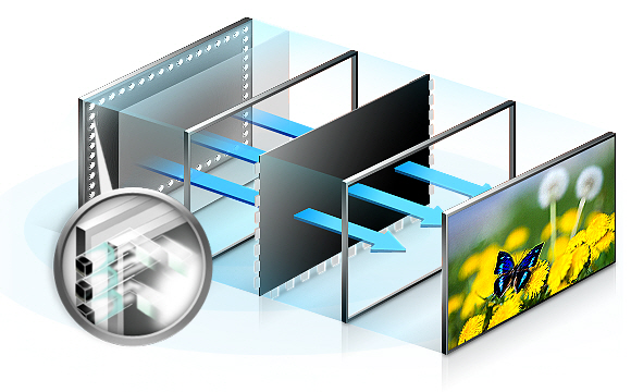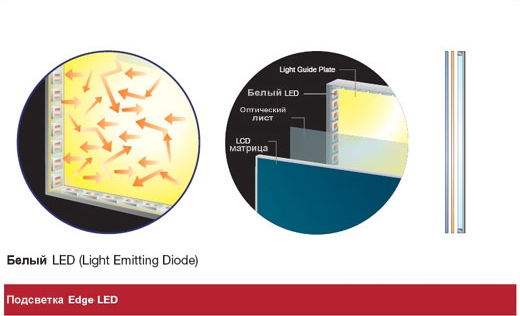 Боковая подсветка белыми светодиодами Edge LED (модели с большим экраном подсвечиваются по периметру) позволяет выпускать очень тонкие дисплеи. Равномерность подсветки обеспечивается отражающей панелью, установленной за экраном. Недостатком Edge LED технологии является то, что нет возможности управлять подсветкой отдельных частей экрана. Подсвечиваются даже черные участки, хотя в этом нет необходимости. Плюсы: как уже говорилось, тонкие дисплеи, низкое энергопотребление, цена.