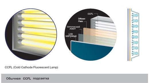 Подсветка жидкокристаллических панелей телевизоров может осуществляться двумя способами: либо при помощи флуоресцентных ламп, либо линеек из светодиодов. В первых моделях жидкокристаллических телевизоров подсветка осуществлялась флуоресцентными (люминесцентными) лампами (CCFL), для питания которых использовалось высокое напряжение от 800 до 1300 вольт, в зависимости от диагонали телевизора. Чем больше диагональ телевизора, тем выше напряжение питания ламп подсветки. Лампы располагались в задней части экрана за жидкокристаллической матрицей, либо сверху и снизу экрана. Впоследствии от флуоресцентных ламп отказались, а им на смену пришли светодиоды (LED). На данный момент телевизоры с подсветкой из ламп не производятся и в продаже их не найти.